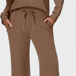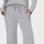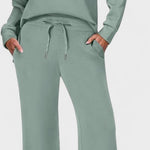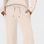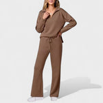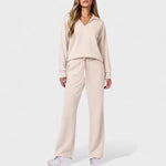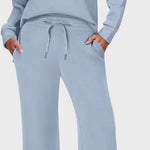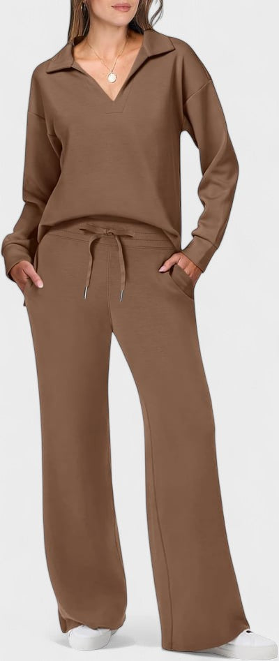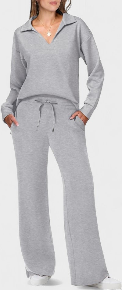 Este conjunto em tom azul suave é a fusão perfeita entre descontração e elegância. Com calças de corte direito e camisola de manga comprida com decote em V, adapta-se a qualquer momento do dia — desde um passeio tranquilo até uma ida ao café. Feito para quem valoriza conforto sem abdicar de estar bem vestida.