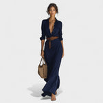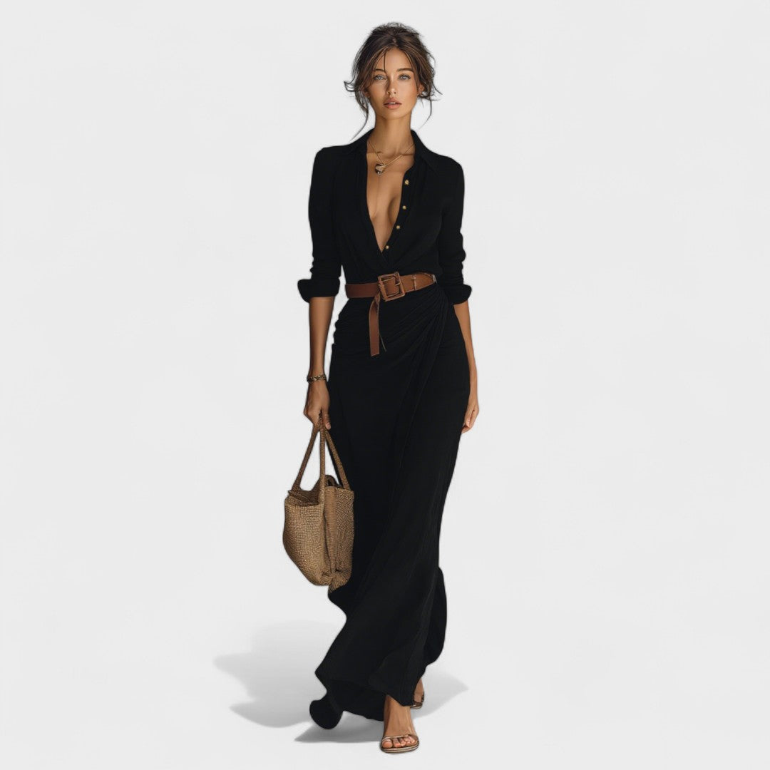 Um elegante vestido maxi caracterizado por um design clássico com gola de lapela, mangas compridas e fecho frontal simples. A cintura com cinto realça a tua silhueta para um look refinado e feminino.