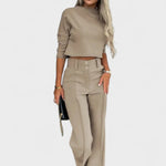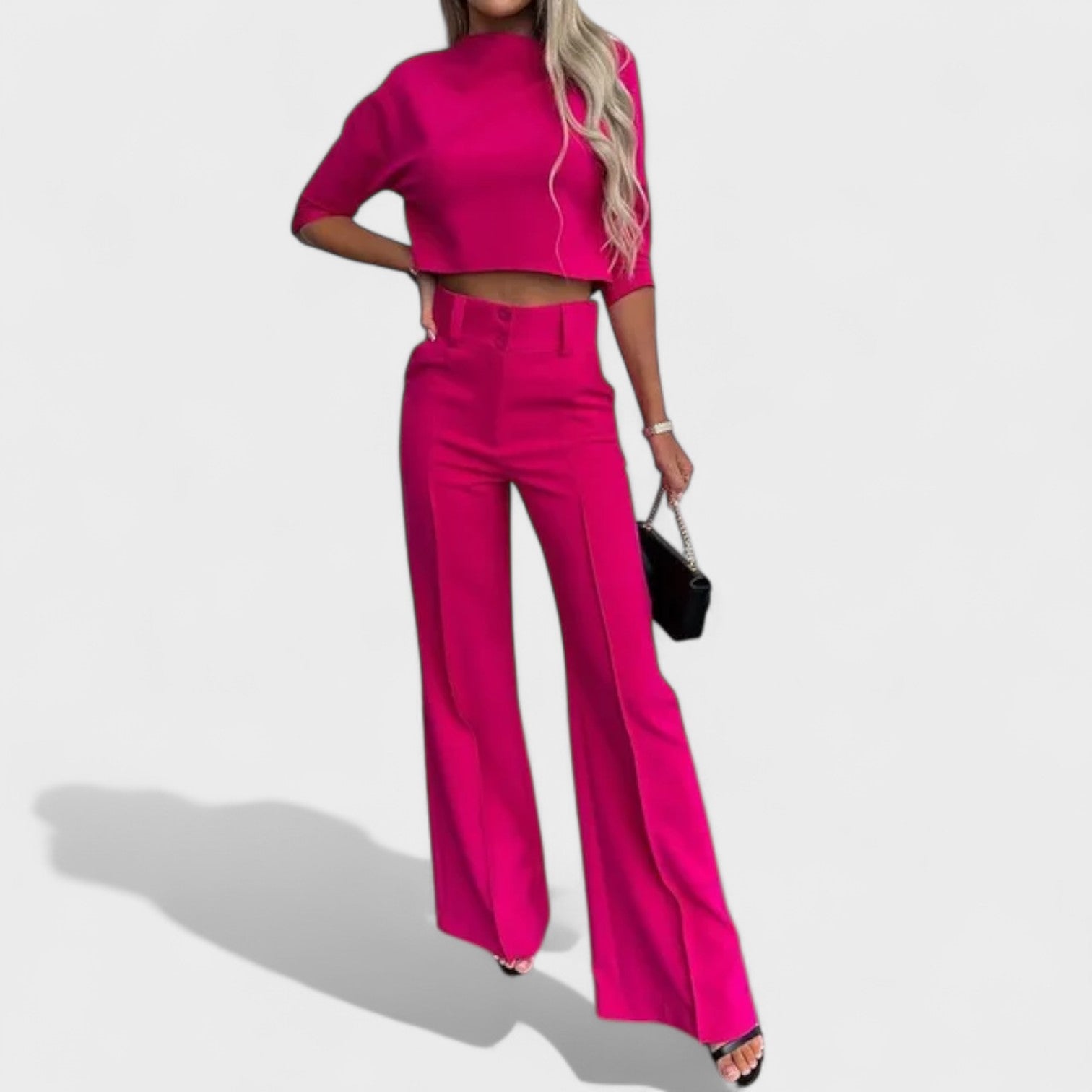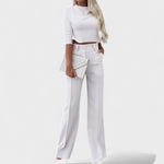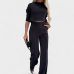 Este conjunto sofisticado de duas peças é a definição perfeita de como aliar conforto e estilo num só look. Com um top cropped de corte moderno e calças de cintura subida com caimento impecável, esta peça é ideal para quem quer transmitir confiança, elegância e sofisticação em qualquer ocasião. O design intemporal e versátil, que facilmente transita do escritório para um jantar requintado ou uma saída à noite.