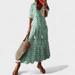 Este vestido longo fluido é a escolha perfeita para quem procura conforto com um toque de elegância natural. Com mangas curtas franzidas, decote em V e pormenores com cordão e pompons, é ideal para dias de sol, passeios descontraídos ou um almoço ao ar livre. O padrão floral inspirado na natureza dá-lhe um charme boho e descontraído, perfeito para a temporada primavera-verão