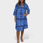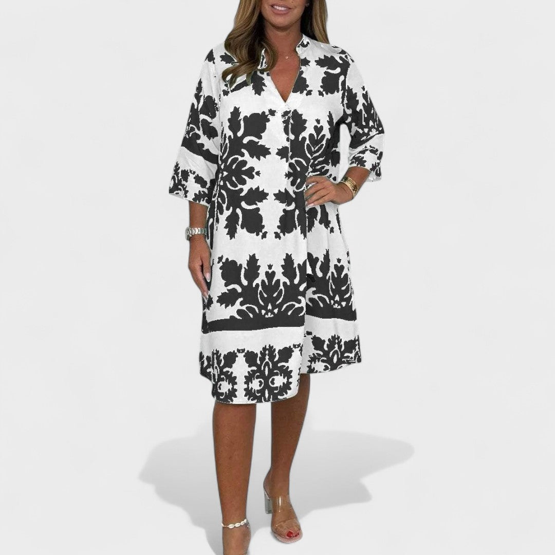 Este vestido é a peça perfeita para quem busca sofisticação sem esforço. Com seu caimento solto, mangas amplas e comprimento até os joelhos, ele garante conforto e liberdade o dia todo. A estampa marcante e o decote em V valorizam a silhueta com um toque moderno e leve. Ideal para momentos descontraídos com estilo ou para aquele fim de semana especial.