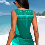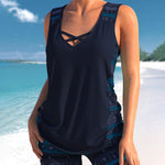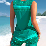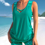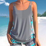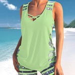 Este tankini combina uma silhueta justa e favorecedora com o máximo conforto. O decote em V e o estampado moderno criam um visual fresco e atual. O top sem aro oferece suporte suave, enquanto o corte sem mangas e os recortes acrescentam um toque elegante. O design ajustado disfarça delicadamente a barriga, fazendo-a sentir-se confiante. Os calções a condizer completam o conjunto e garantem liberdade de movimentos em qualquer atividade de verão.