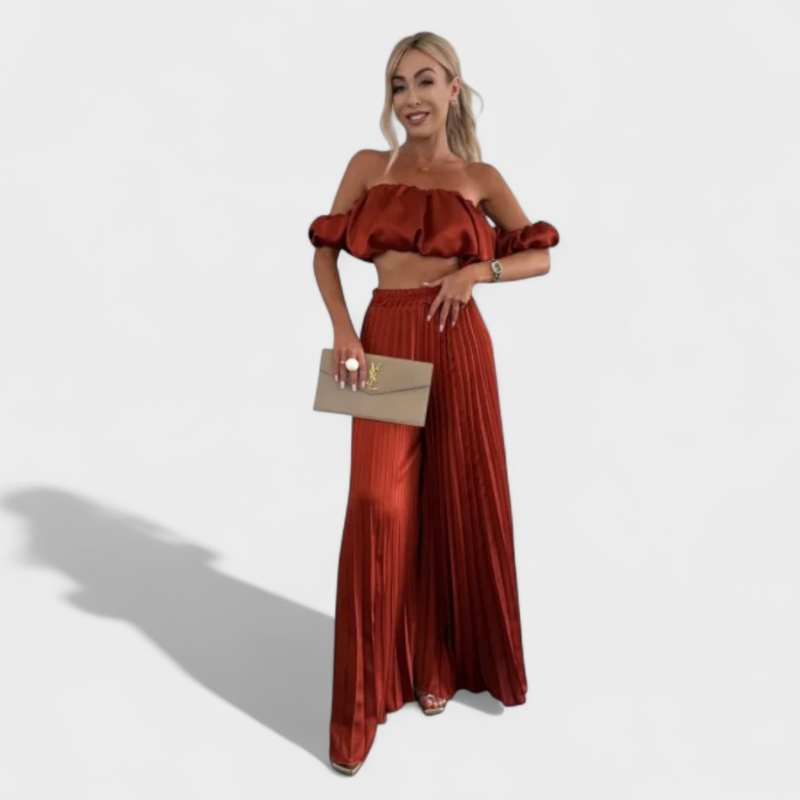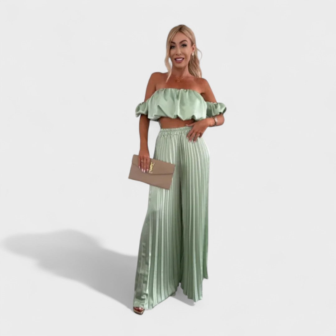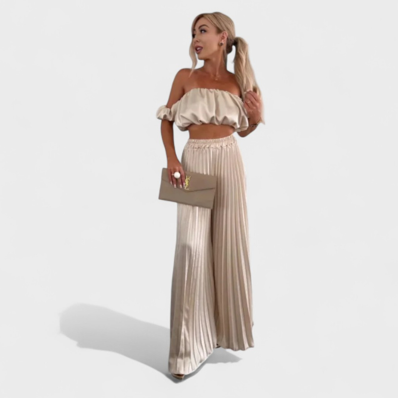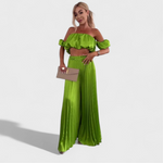 Este conjunto é a escolha perfeita para quem quer estar bem-vestida com conforto e estilo. O top ombro a ombro com babados traz um toque feminino e romântico, enquanto a calça plissada de cintura alta alonga a silhueta com fluidez e elegância. Ideal para eventos, saídas noturnas ou produções fashion no dia a dia.