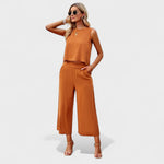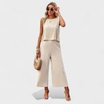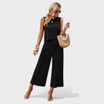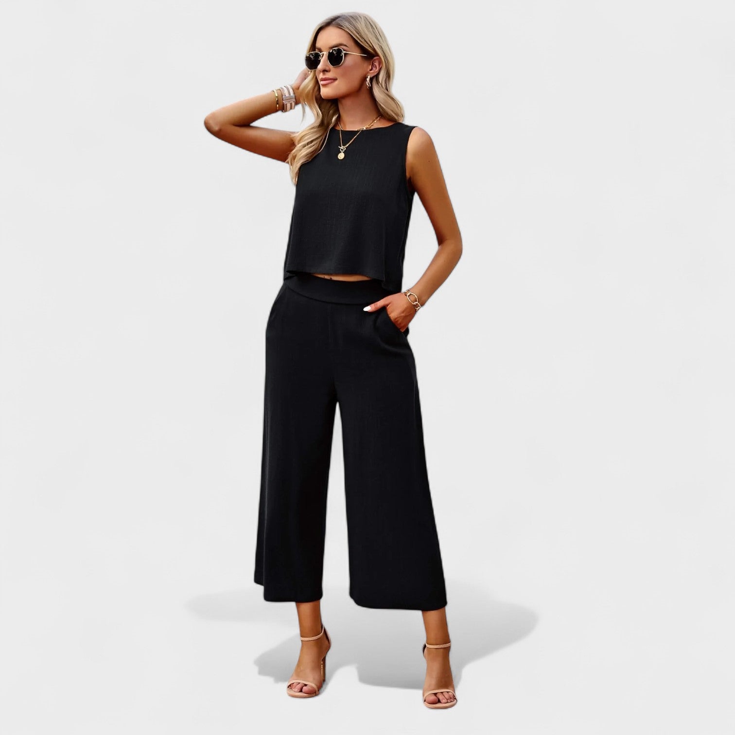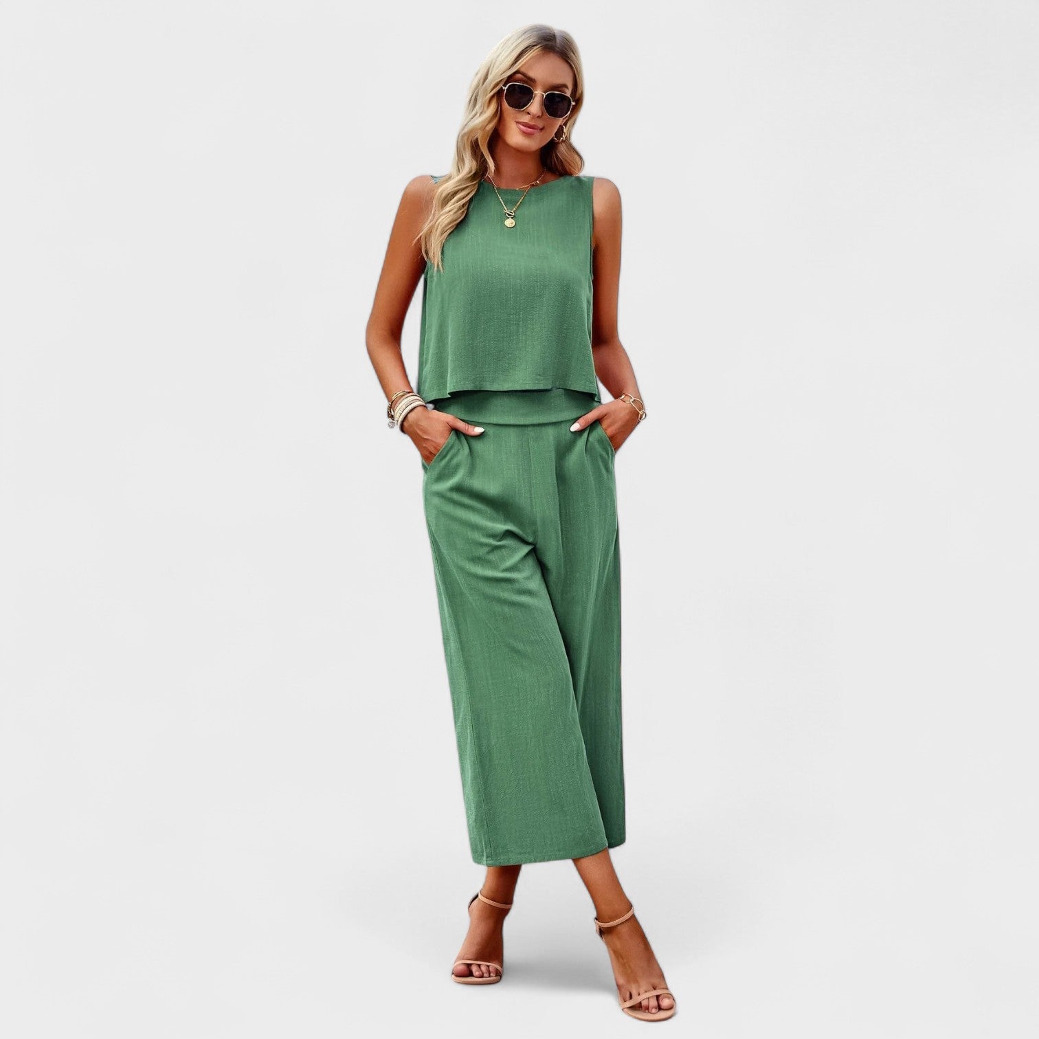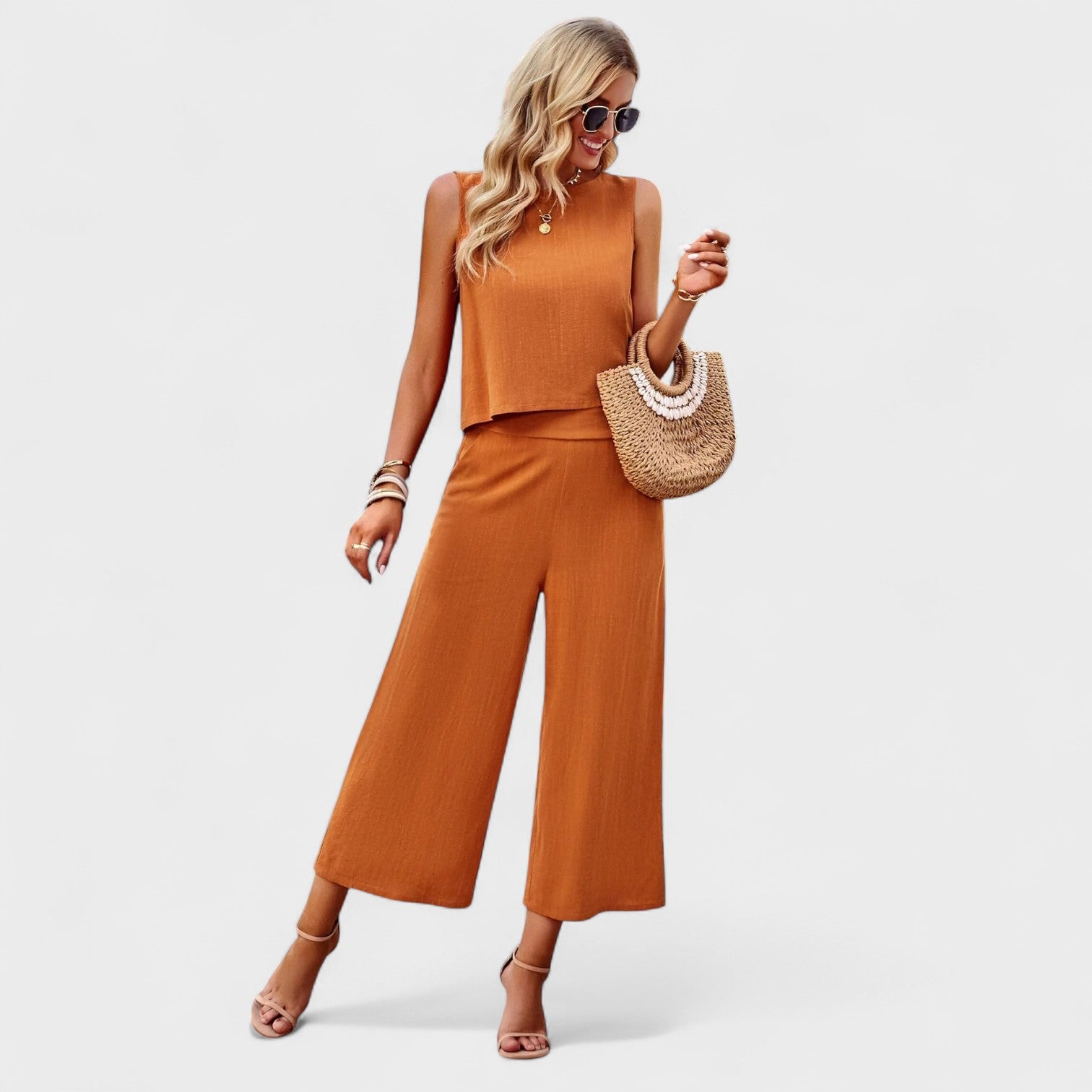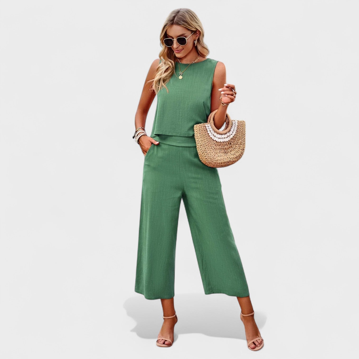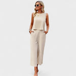 Este conjunto de linho é a escolha perfeita para quem valoriza elegância sem esforço. Com top sem mangas de corte reto e calça reta de cintura alta, ele entrega um visual moderno, fresco e extremamente confortável.