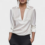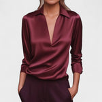 Acabamento Luxuoso em Cetim: Confeccionada em cetim de alta qualidade, a Blusa Premium Decote em V oferece um brilho suave e elegante que eleva instantaneamente qualquer look. Sua textura sedosa é macia ao toque, garantindo conforto durante todo o dia.