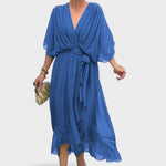 Este vestido preto fluido combina sofisticação e leveza com detalhes étnicos bordados que o tornam verdadeiramente único. Com mangas largas, decote em V e um laço ajustável na cintura, valoriza qualquer silhueta com conforto e estilo. O detalhe bordado em tons vibrantes adiciona um charme artesanal que transforma um look simples numa afirmação de bom gosto.