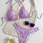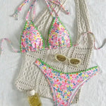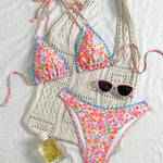 Este biquíni de atar ao pescoço é perfeito para mulheres que valorizam conforto e um corte favorecedor. O top sem aro oferece suporte suave sem apertar, enquanto as alças ajustáveis garantem um ajuste perfeito. O estampado patchwork com detalhes rendados chama a atenção para os seus pontos fortes e dá-lhe um visual fresco e estival. Os laços laterais nas cuecas acrescentam um toque divertido que completa o conjunto.
