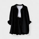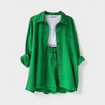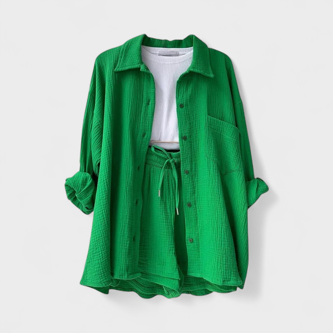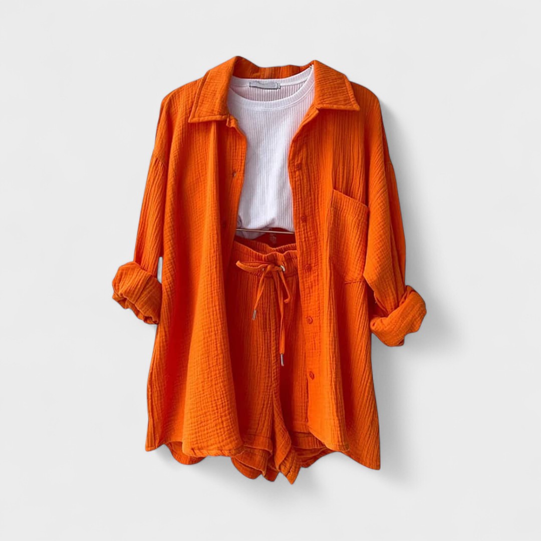 Este conjunto casual em tecido gaze de algodão é a definição perfeita de conforto moderno. Composto por camisa oversized, calções com cintura ajustável e uma t-shirt básica, o conjunto combina suavidade ao toque com uma estética minimalista e versátil. Ideal para relaxar com estilo ou para um passeio descontraído, adapta-se facilmente a várias ocasiões, mantendo sempre o visual cuidado e atual.